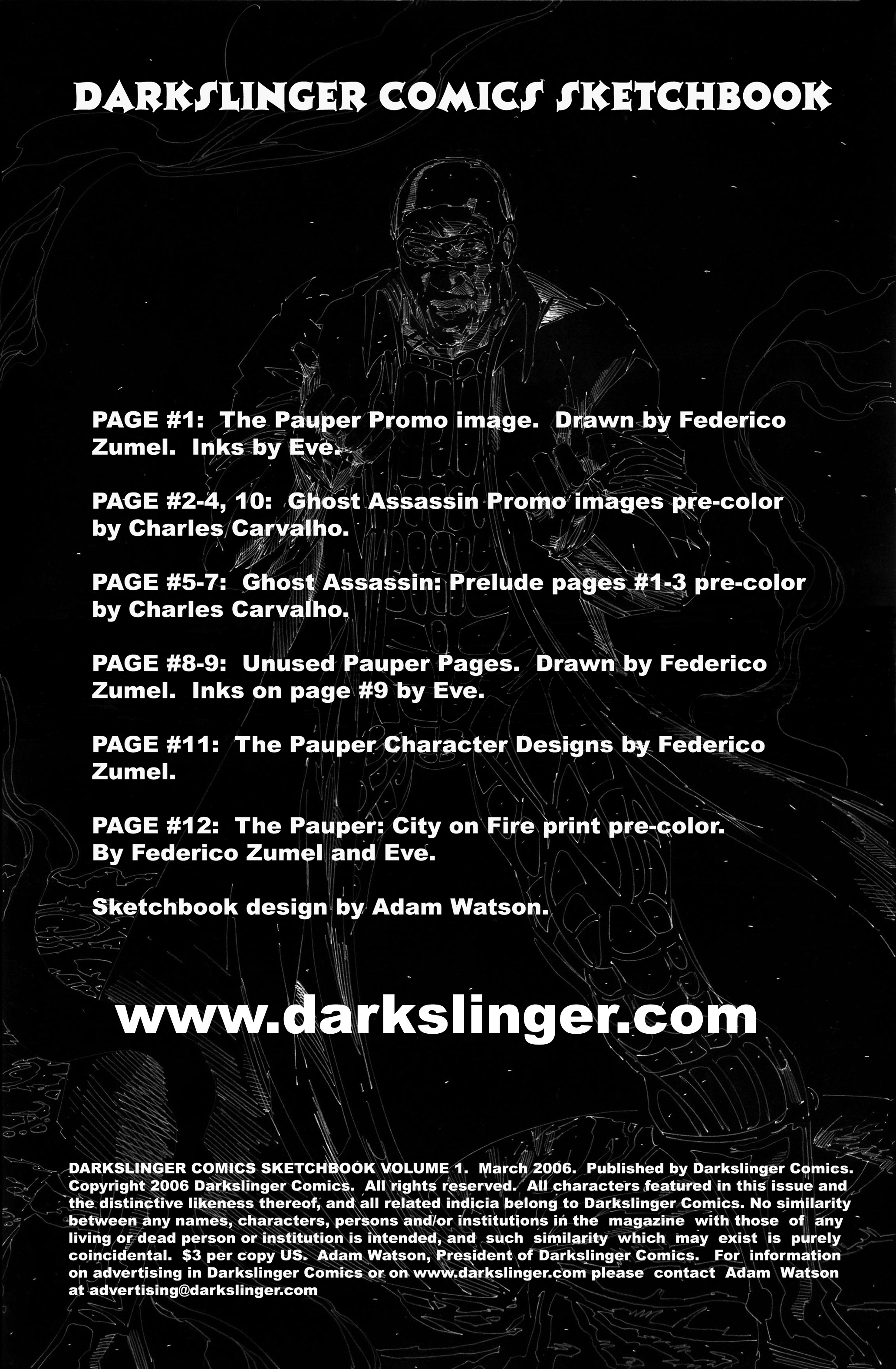 Darkslinger Sketchbook Volume 1 featuring character designs, sketches and unfinished pages from Ghost Assassin and The Pauper.