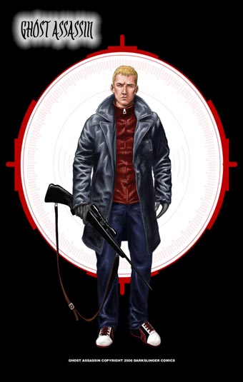 Ghost Assassin: David in White Scope Sights poster. Dimensions are 11x17 Inches. Artwork by Charles Carvalho. Ghost Assassin copyright 2013 Darkslinger Comics.