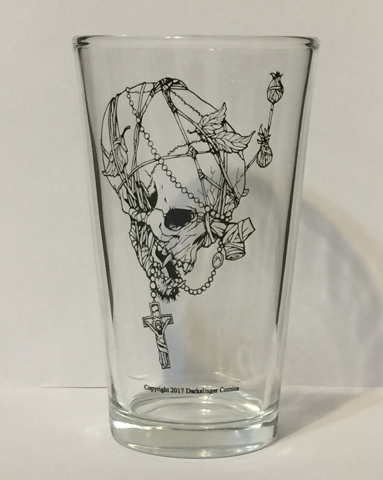 Chronicles of Van Helsing 15 Ounce glass featuring a vampire skull that has been staked. Illustrated by Tony Morgan.