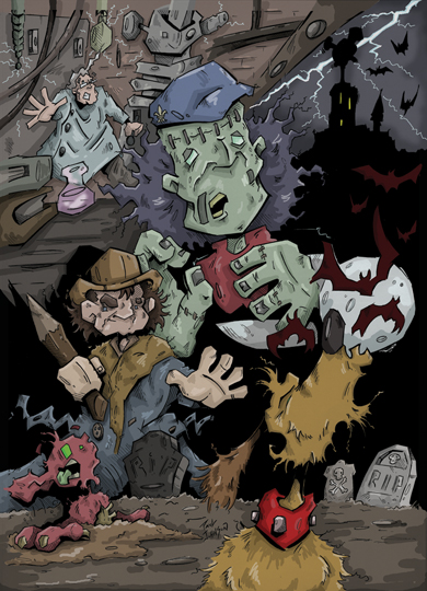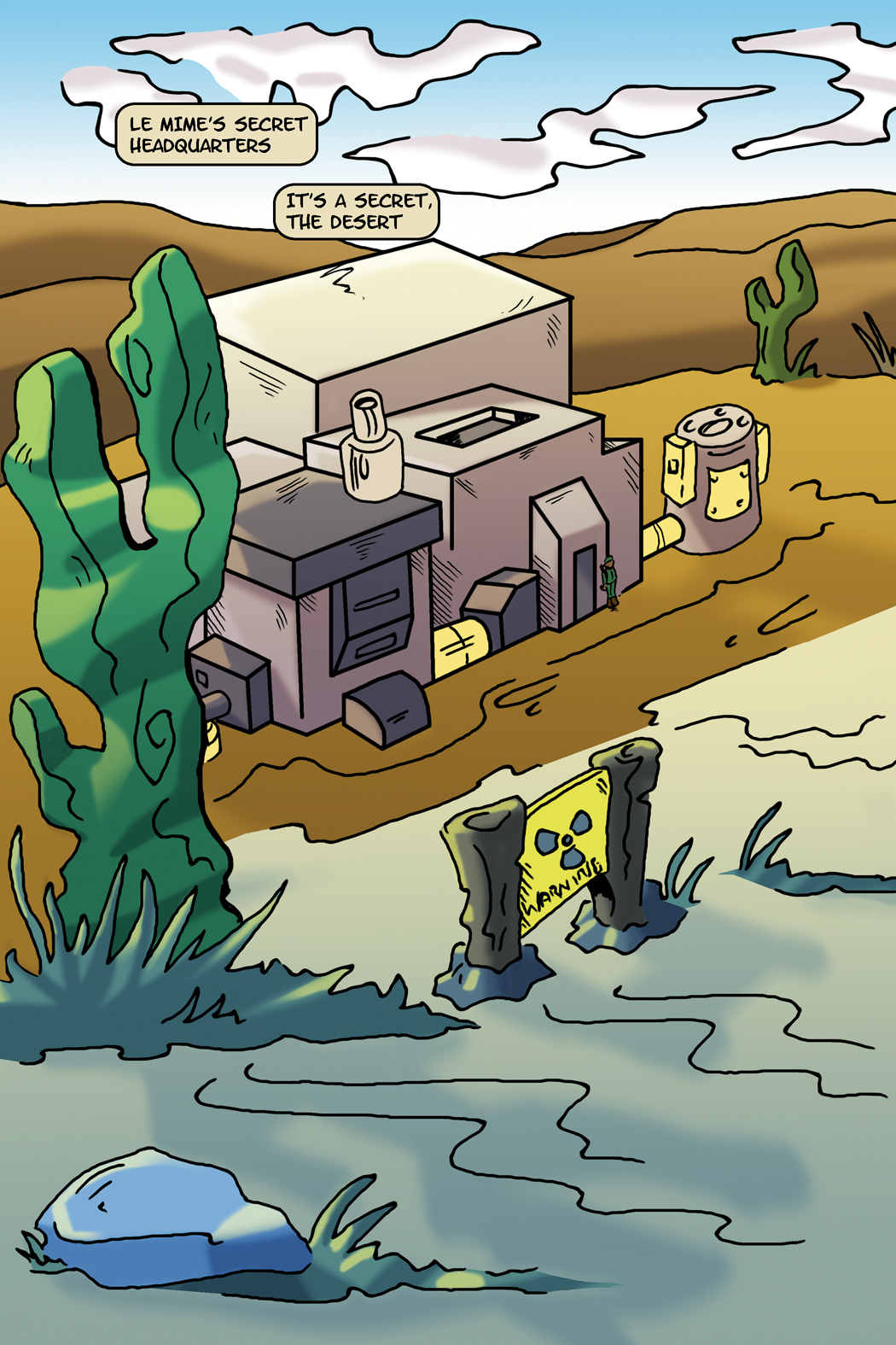 El Bovine Muerte is an ongoing color comic that tells the story of Le Mime, a brilliantly insane industrialist and his greatest invention, Muerte. Muerte is a cow that is genetically engineered to create the world's greatest cheese. Muerte's cheese is so great in fact, that just one bite will erase your mind.