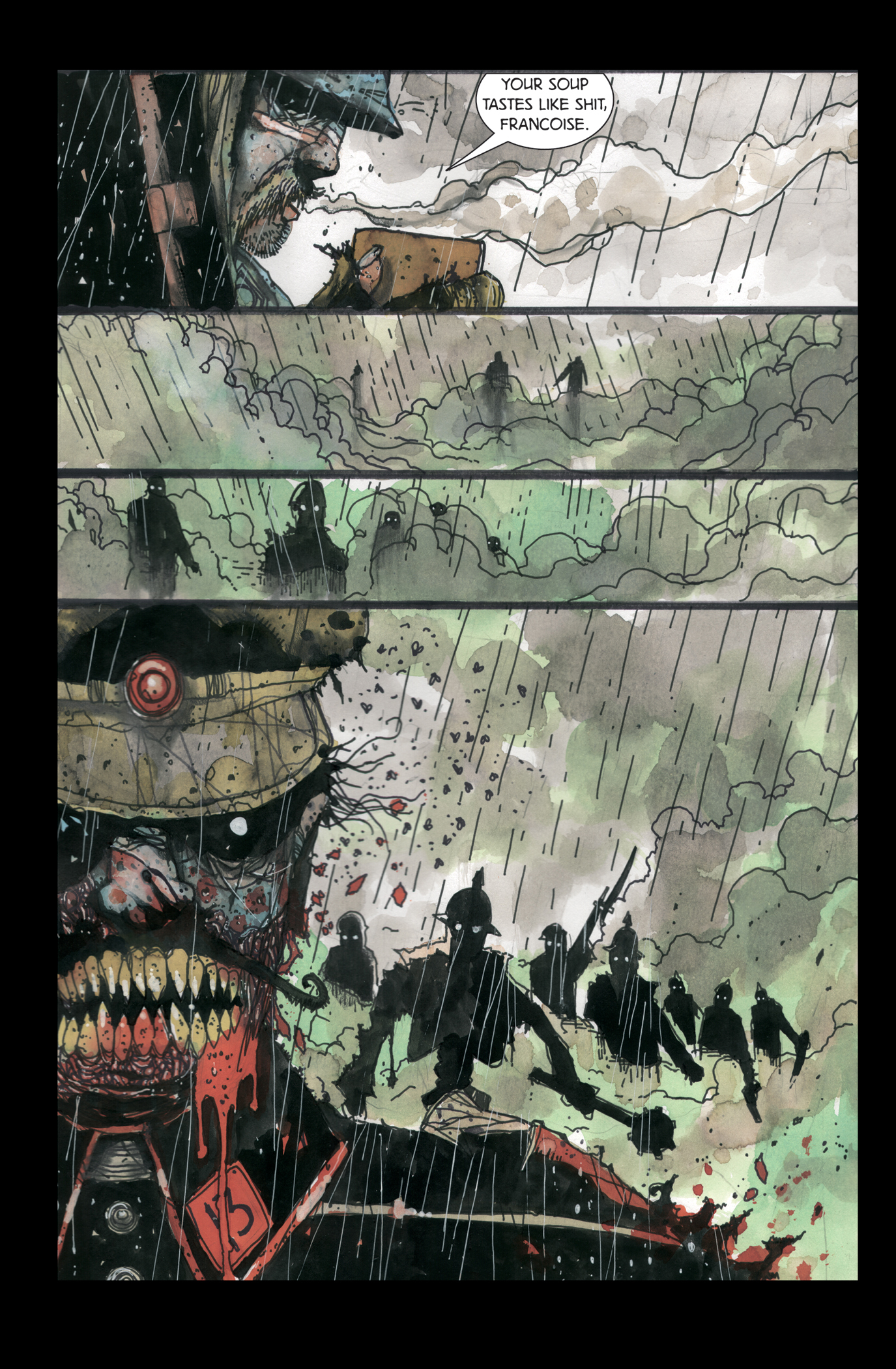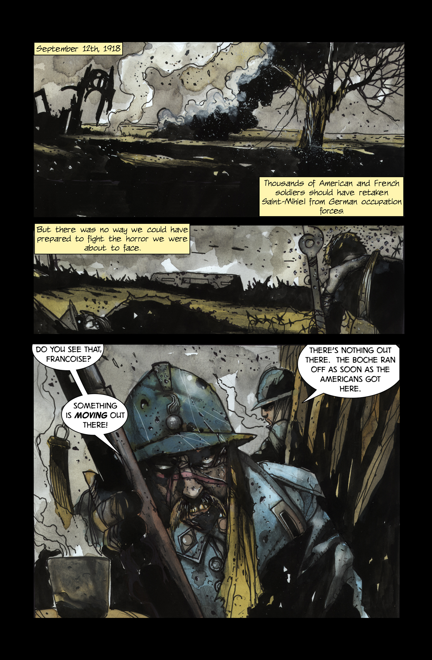 The Western Front. September 12, 1914. It’s early morning in the French trenches. Two soldiers eat as rain drowns the land. A strange green cloud covers the land as the sun rises. The smell of death grows as a sinister shadow is cast upon the trenches: the Germans are attacking. The French quickly arm themselves and open fire on the approaching enemy soldiers, but their bullets might as well be spit balls. The German soldiers who do fall, rise instantly and continue their approach. What ensues is a morning of massacre, the French had no chance. When the Medical teams arrive, all that remain are pieces of what were once soldiers: devoured by an unknown weapon.